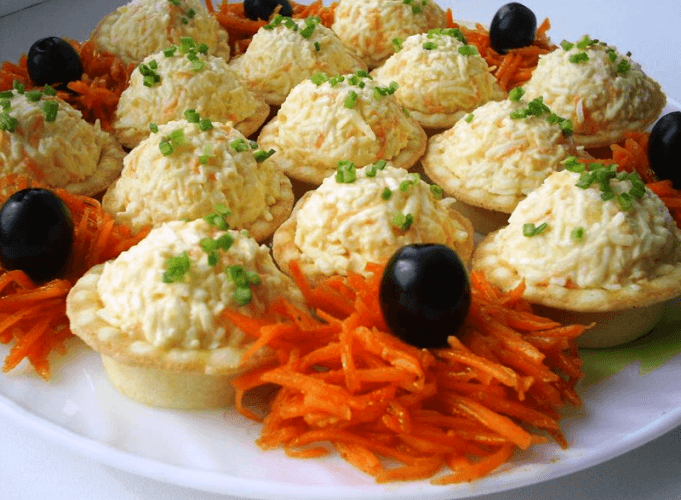 5. Салат из плавленых сырков в тарталетках всегда пользуется популярностью и украшает праздничный стол. Тарталетки можно приобрести в магазине, испечь из слоеного теста или по любому из известных рецептов.