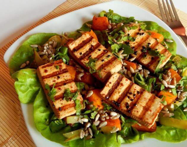 Если вы готовы к экспериментальным кулинарным исследованиям по изучению новых оттенков вкусов, то оригинальный рецепт пикантного салата из тофу с тыквой – то, что вам нужно. Копченый тофу по предписанию рецепта должен быть поджарен на гриле, но вполне достаточно будет и сковороды гриль.
