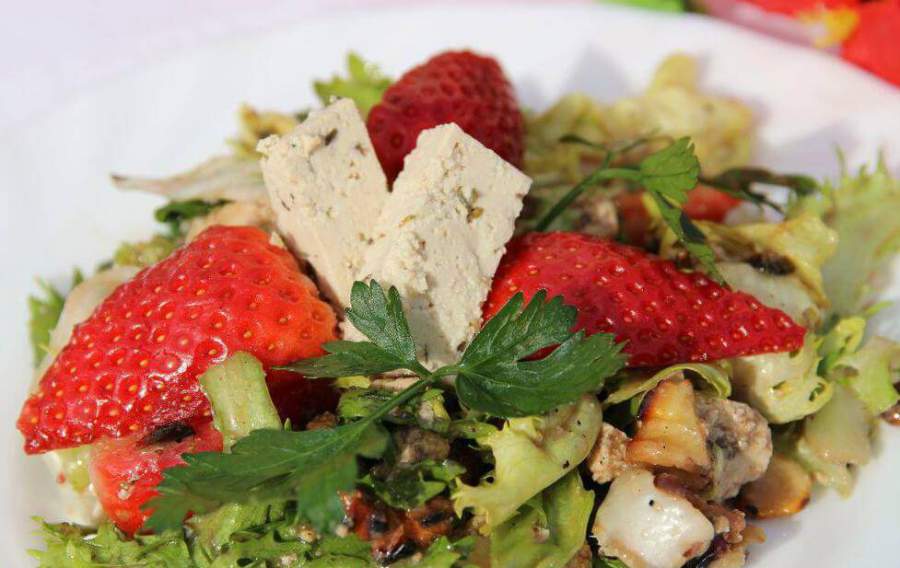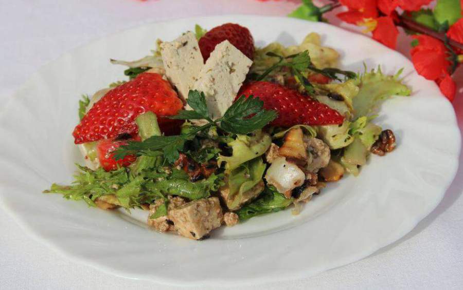 4. В глубоком салатнике соедините листья салата, поджаренные грецкие орехи, тофу и клубнику.