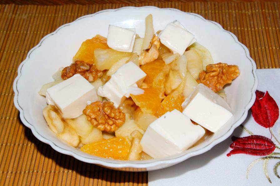 7. Салат с тофу и фруктами полейте приготовленной заправкой. Перед подачей к столу охладите в холодильнике.