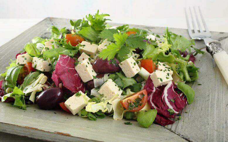8. Салат из тофу с зеленью и соусом винегрет хорошо сочетается с овощами на гриле, рисовыми или макаронными блюдами.