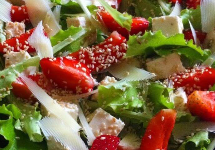 7. Перед подачей полейте салат с сыром и клубникой смесь оливкового масла с бальзамическим уксусом. Подайте такой салат сразу же, после приготовления.