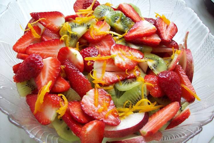 Этот салат подойдет в качестве десерта на праздничный стол или для романтического ужина. Вы можете экспериментировать, заменяя ингредиенты салата другими ягодами и фруктами, оставляя неизменным общее количество, и учитывая правило их совместимости.