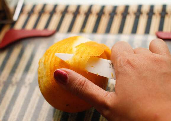 Существует много способов и приспособлений для снятия цедры с цитрусовых плодов. Можно снять цедру и при помощи обычного острого ножа. Если вам нужна не тертая цедра, снимайте ее тонкими полосками, стараясь не задеть белый подкожный, который горький, и может испортить вкус цедры. Затем полоски нарежьте как можно тоньше