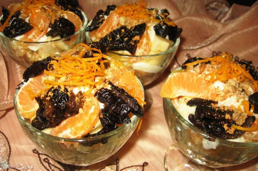 7. Снова, чередуя слои, положите остаток яблок, апельсинов, налейте оставшиеся сливки с сахарной пудрой. Разложите сверху чернослив и оставшиеся дольки мандаринов.
