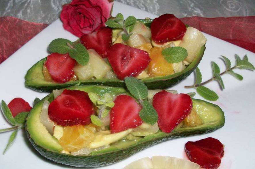 Предлагаем рецепт простого, но необычного фруктового салата «Праздник Влюбленных». Необычный он потому, что состоит из ингредиентов с фруктовыми афродизиаками, стимулирующими и усиливающими любовь. Авокадо, ананас, груши и клубника – плоды, обладающие этой магической силой, известной из древности.