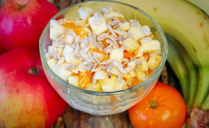 Среди множества закусочных блюд особо выделяются фруктовые салаты, которые не только помогают утолить голод, но и насыщают организм витаминами, радуя отличными десертными качествами. Предлагаем вашему вниманию рецепт фруктового салата с йогуртом и семечками, хоть и сладкого, но достаточно легкого.