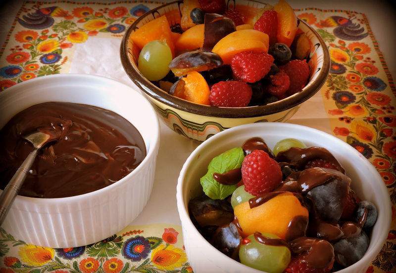 6. Фруктовый салат с теплым шоколадным соусом немедленно подайте к столу.