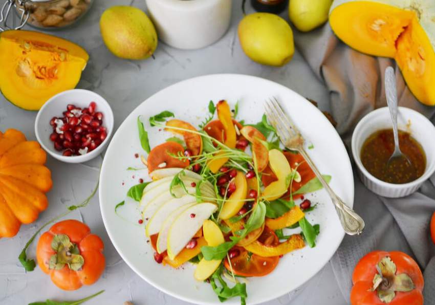 Когда за окном засилье серых туч и зябких дождей с рывками ветра, яркие на цвет и вкус блюда поднимают настроение с воспоминаниями о золотой красочной осени. Предлагаем рецепт одного из таких блюд – ароматного осеннего фруктового салата с тыквой и маслом грецкого ореха из сезонных фруктов и овощей.