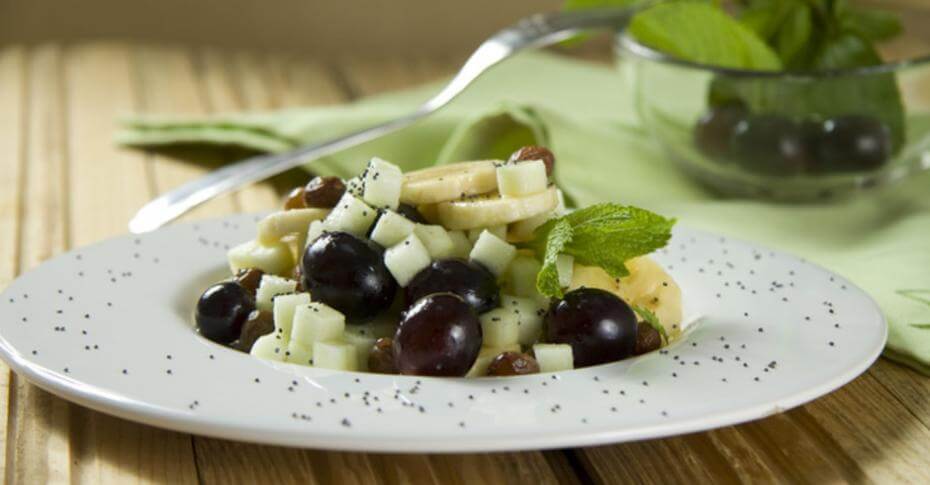 Предлагаем рецепт десертного блюда – фруктового салата с маком. В основной набор ингредиентов входят яблоки, виноград, бананы, изюм. В сочетании с ароматной заправкой на основе рома, апельсинового сока и кунжутного масла и благодаря маковой посыпке, салат имеет отличный вкус и эффектный внешний вид.