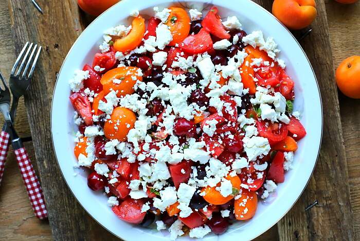 3.Выложите приготовленный салат на большое плоское блюдо, сверху раскрошите сыр. Салат из абрикосов, помидоров и черешни готов. Подавайте его к столу сразу после приготовления.