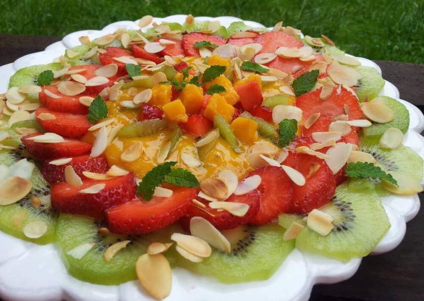 7. Посыпьте все обжаренными миндальными хлопьями и свежими листьями мяты. Салат на вашей тарелке будет напоминать красивый благоухающий цветок.
