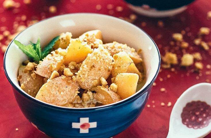 8. Разложите абрикосы с йогуртовой заправкой по креманкам, а непосредственно перед подачей салат с абрикосами и песочным печеньем посыпьте крошкой из печенья.
