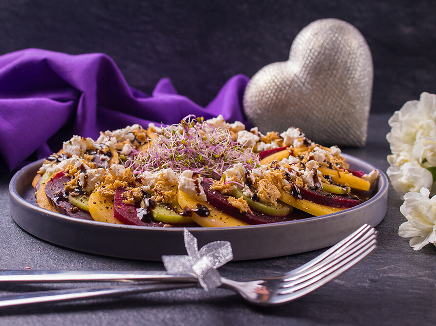 Предлагаем вашему вниманию рецепт салата для влюбленных из свёклы, хурмы и киви, который идеально подходит в качестве закуски для романтического ужина. Этот салат изумляет оригинальной комбинацией сладких овощей и фруктов (свёклы, хурмы, киви) с ароматным козьим сыром и типичным десертом – халвой.