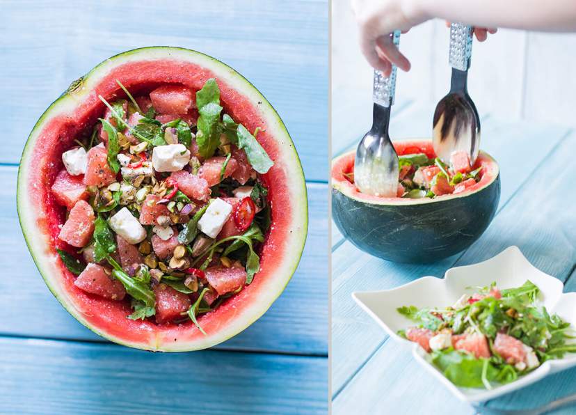 5.Салат из арбуза с фетой, фисташками и мятой готов. Подавайте его к столу и наслаждайтесь. Как вариант, можно уложить салат и в мисочки из арбуза – выглядеть будет впечатляюще.
