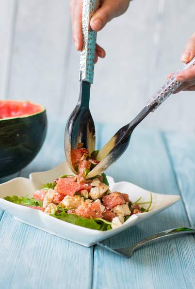 Готовим салат из арбуза с фетой, фисташками и мятой